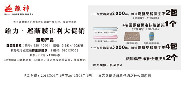 一次性購買滿3000元,贈(zèng)送高新結(jié)構(gòu)抺塵布(龍神編號(hào):62212000)2包+法國佩釜標(biāo)準(zhǔn)快速接頭(龍神編號(hào):36102000)1個(gè)