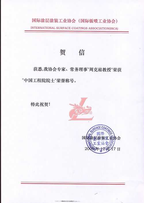 賀國際涂層涂裝工業(yè)協(xié)會(huì)專家常務(wù)理事克崧教授榮獲“中國工程院院士”[龍神秘書單位處] 賀國際涂層涂裝工業(yè)協(xié)會(huì)專家常務(wù)理事克崧教授榮獲“中國工程院院士”[龍神秘書單位處] 珠海龍神有限公司秘書處賀 2009-12-19 9034
