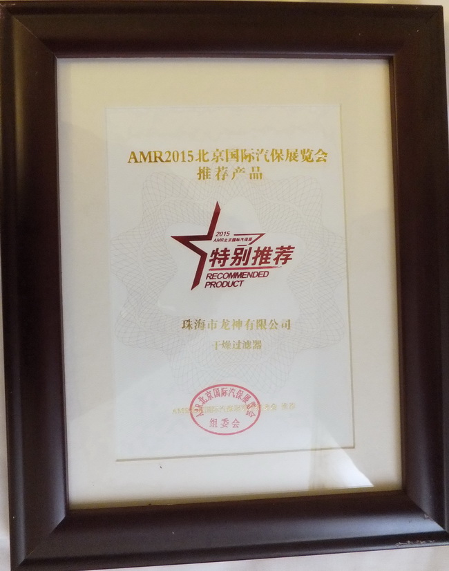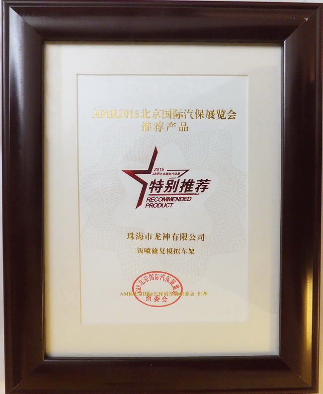 2015年4月8日,2014年度“20佳汽保產(chǎn)品”、“20佳維修工具”、AMR2015北京國際汽保展推薦產(chǎn)品頒獎晚宴于北京成功舉辦。珠海龍神“干燥過濾器”,“鈑噴修復模擬車架”榮獲ARM2015北京國際汽保展覽會推薦產(chǎn)品獎。