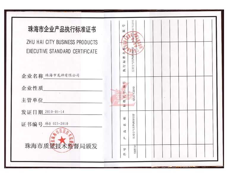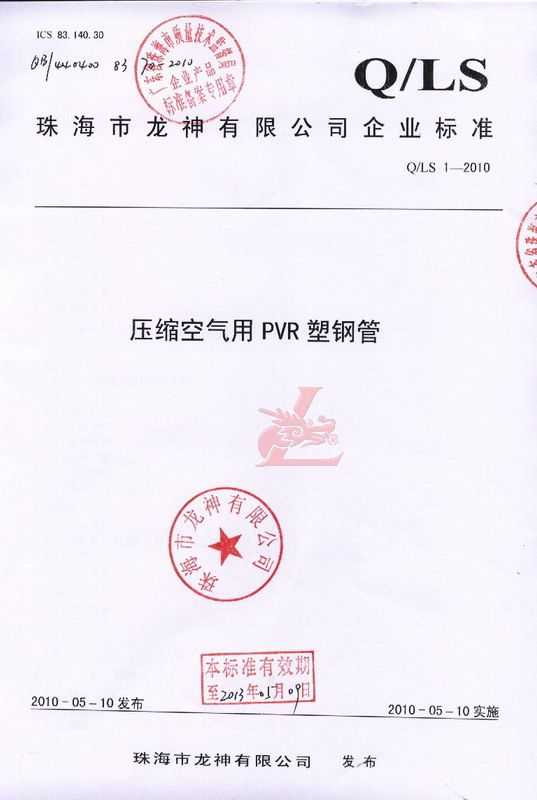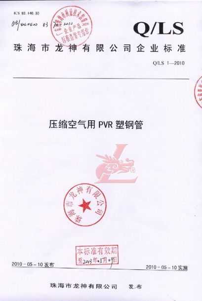 龍神壓縮空氣PVR塑鋼管成功申請企業(yè)執(zhí)行標準 2010年5月珠海市龍神有限公司“壓縮空氣PVR塑鋼管”得到珠海市質(zhì)量技術(shù)監(jiān)督局認可,特此頒發(fā)“壓縮空氣PVR塑鋼管企業(yè)執(zhí)行標準”,龍神公司在嚴格執(zhí)行標準下,保證產(chǎn)品質(zhì)量。 2010-05-20 9912