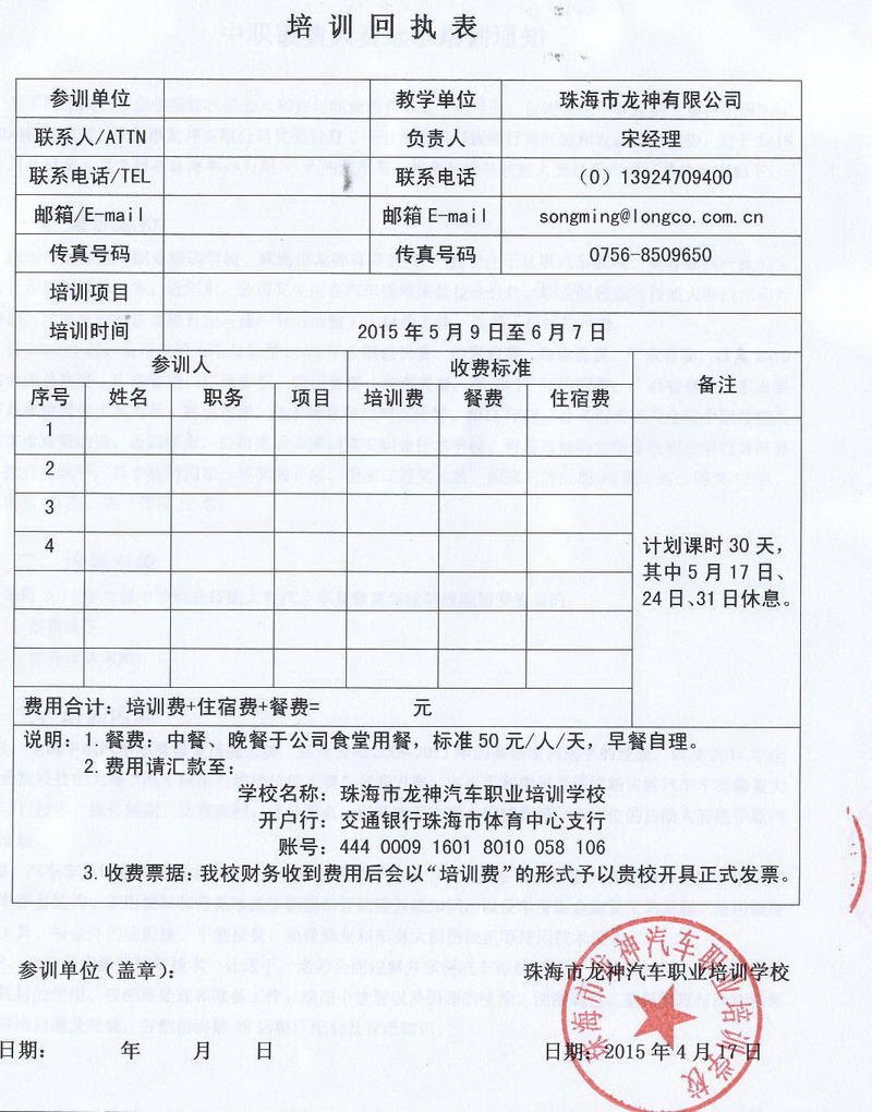 培訓(xùn)時間30天,即從2015年5月9日起至6月7日止,其中5月17日、24日31日休息;期間餐費(fèi)按照上課時間27天預(yù)收,實(shí)際參照離開時間調(diào)整。具體收費(fèi)情況請來電咨詢。