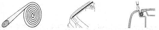 縫隙膠帶是一種遮蓋材料,用于在發(fā)動機罩或車門處,防止涂料透入縫隙??p隙膠帶為聚氨酯泡沫體,并加入粘合劑而制成,因此它簡化了有縫隙區(qū)域的遮蓋。它呈圓柱形,因此可以防止噴涂臺階,使涂裝的表面很容易打磨(如圖4-1-2)。